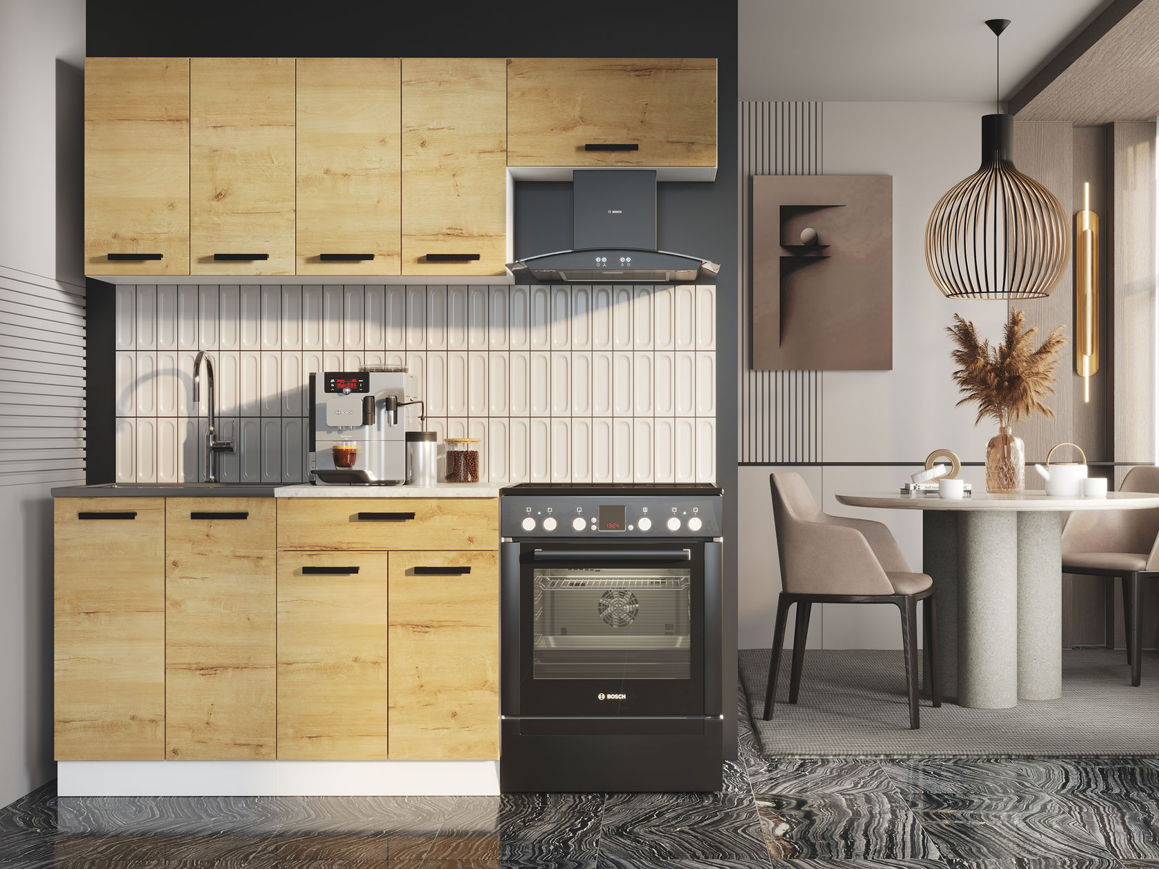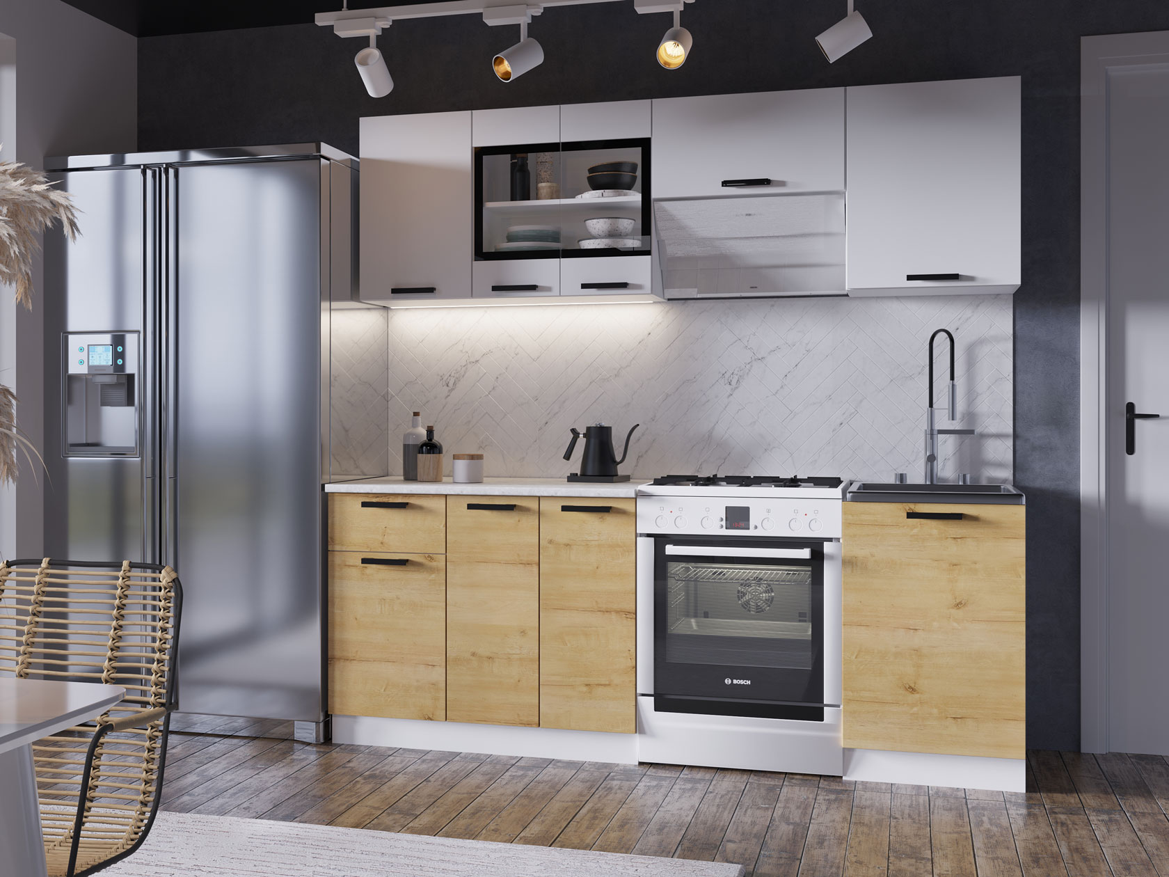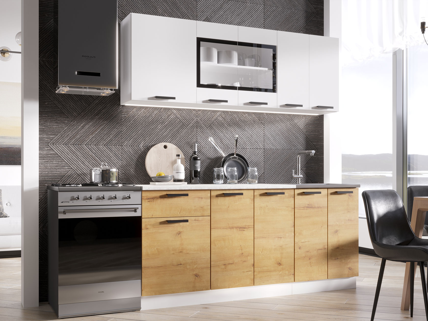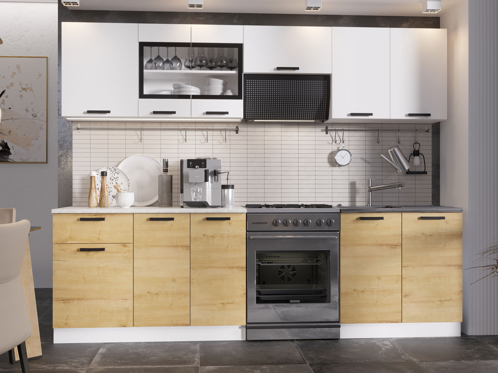 Белый гладкий / Дуб Вотан / столешница Калаката / Со шкафом под вытяжку / 240 см