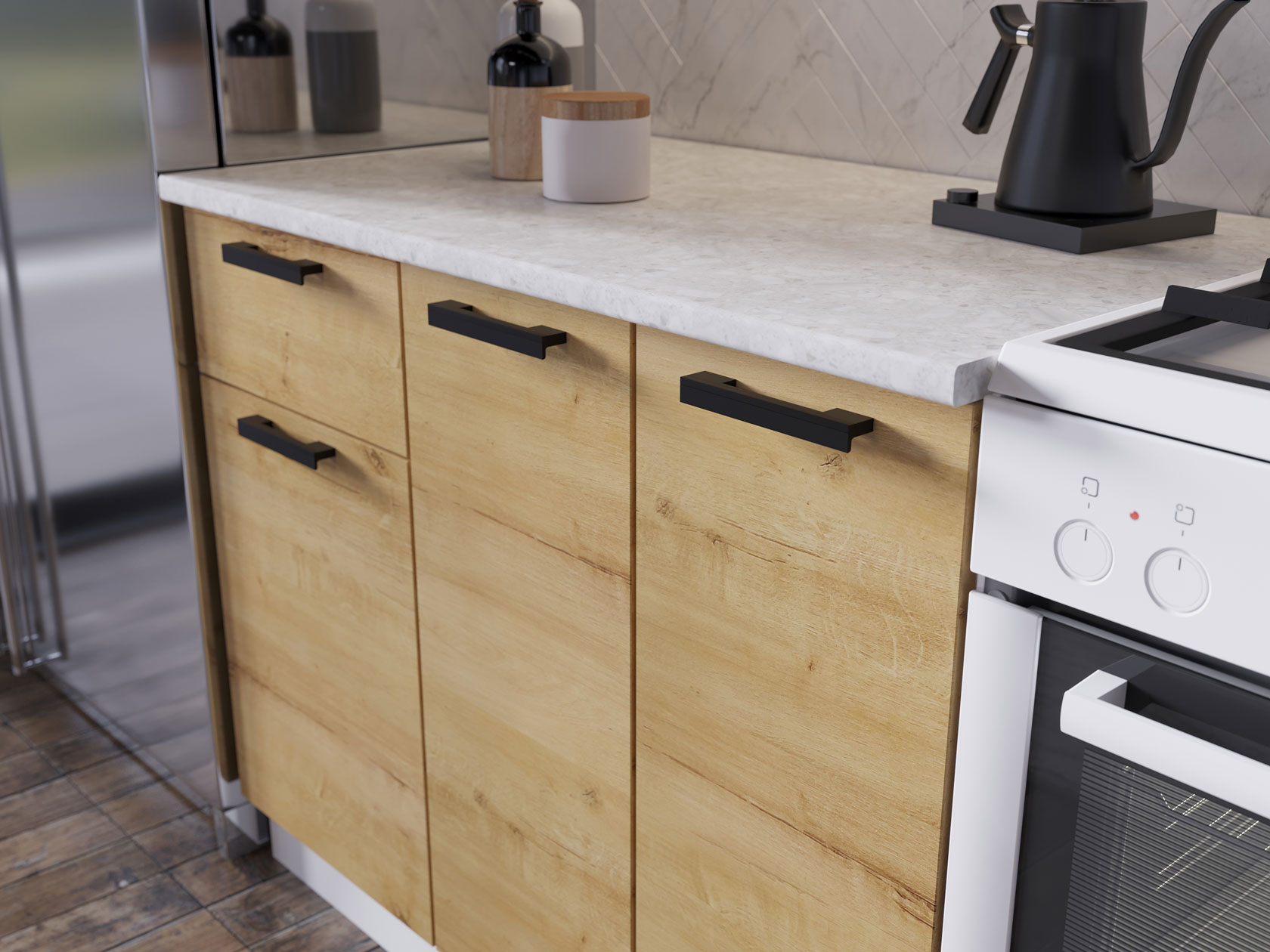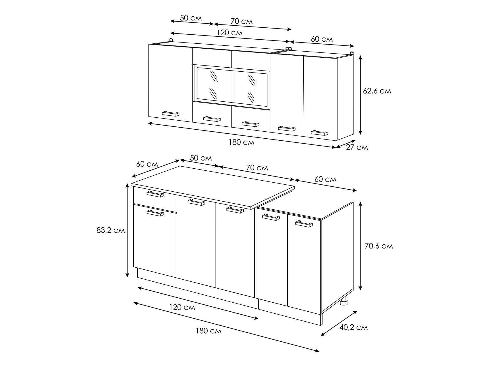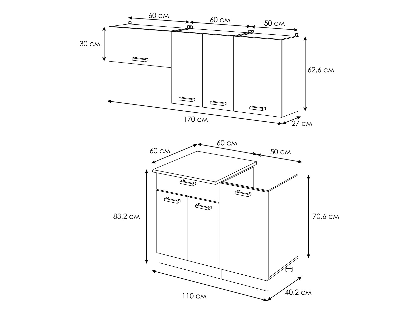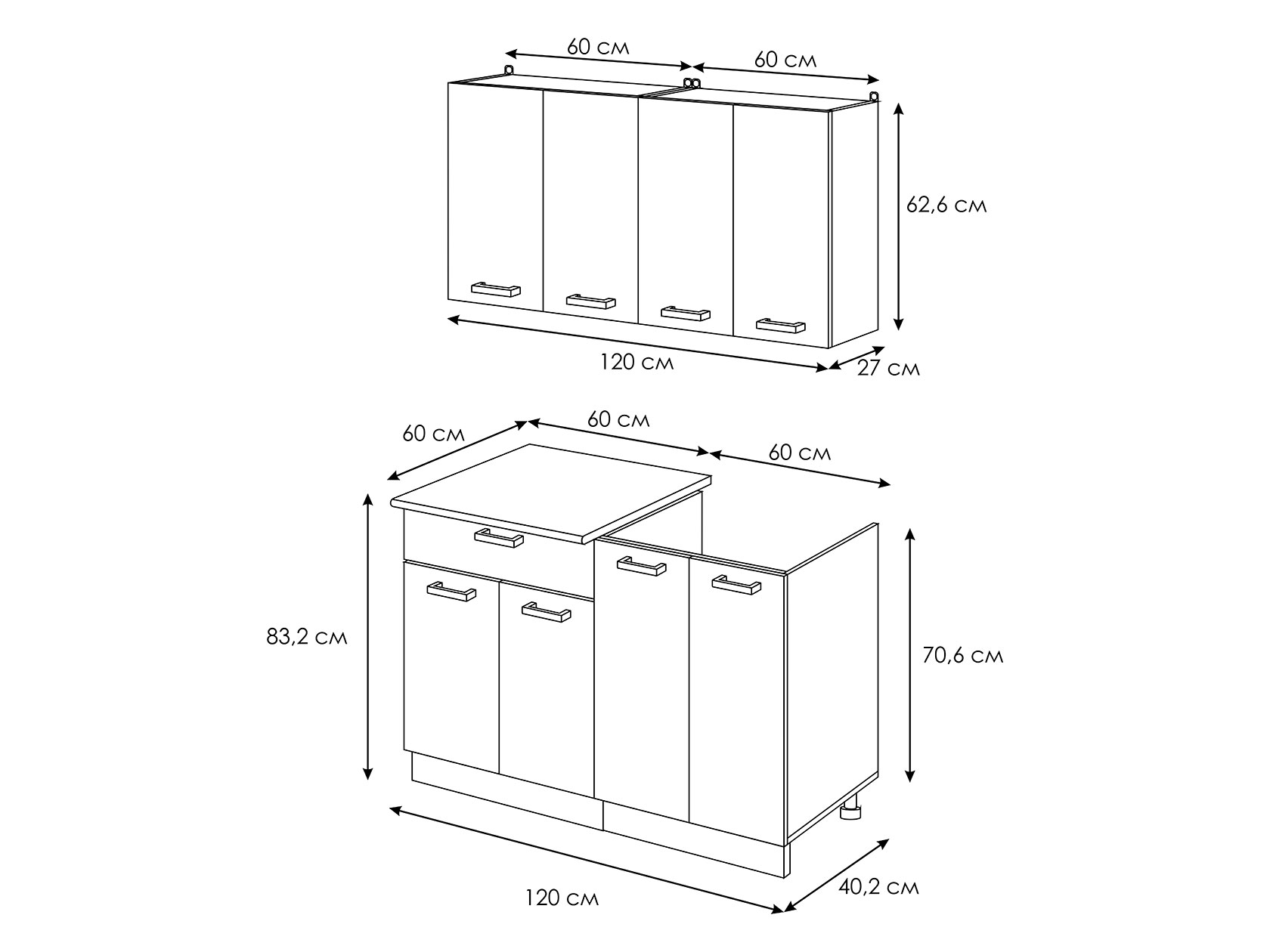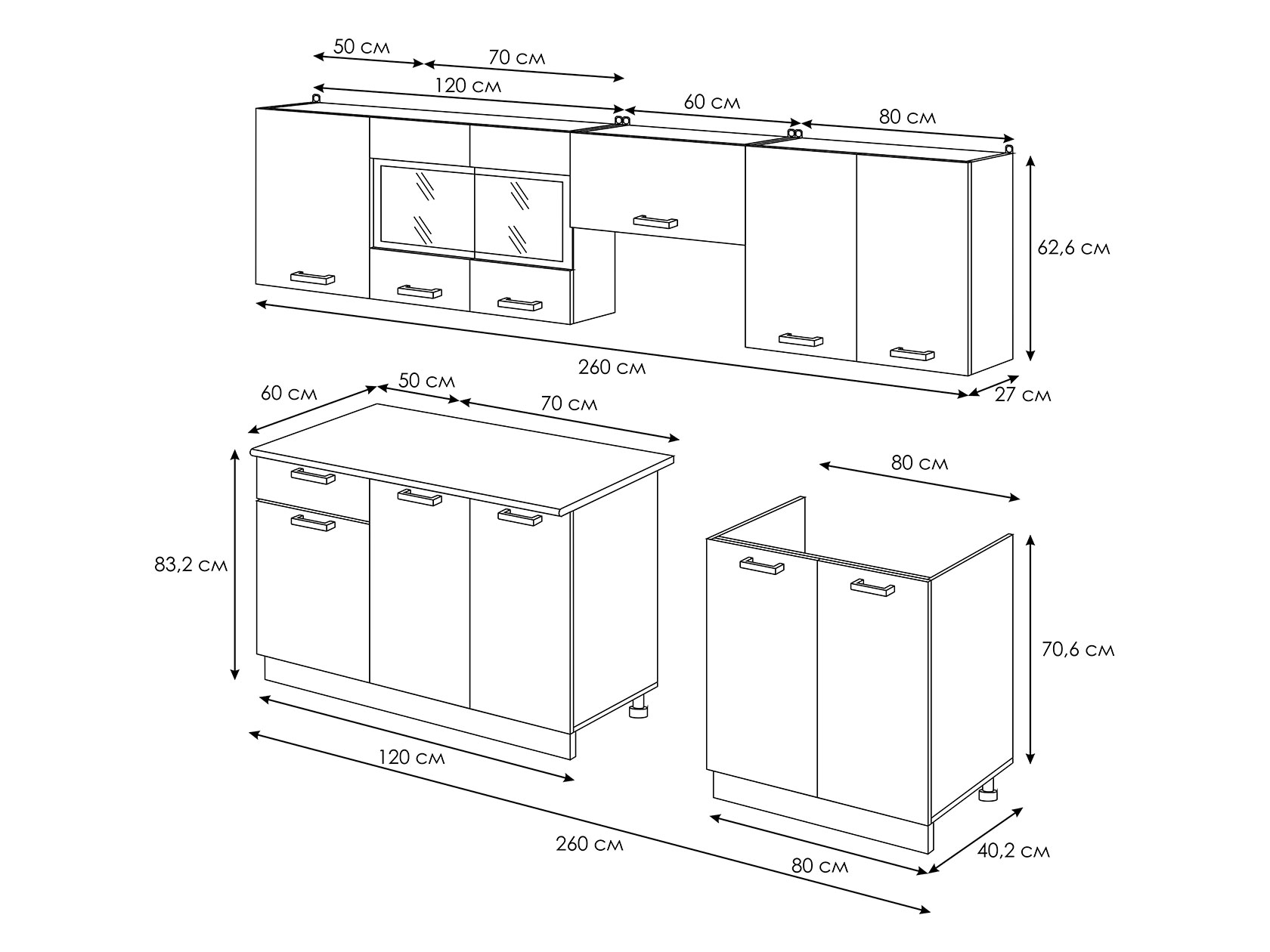 Глубина нижних шкафов: без дверок — 40 см, с дверцами — 42 см.
