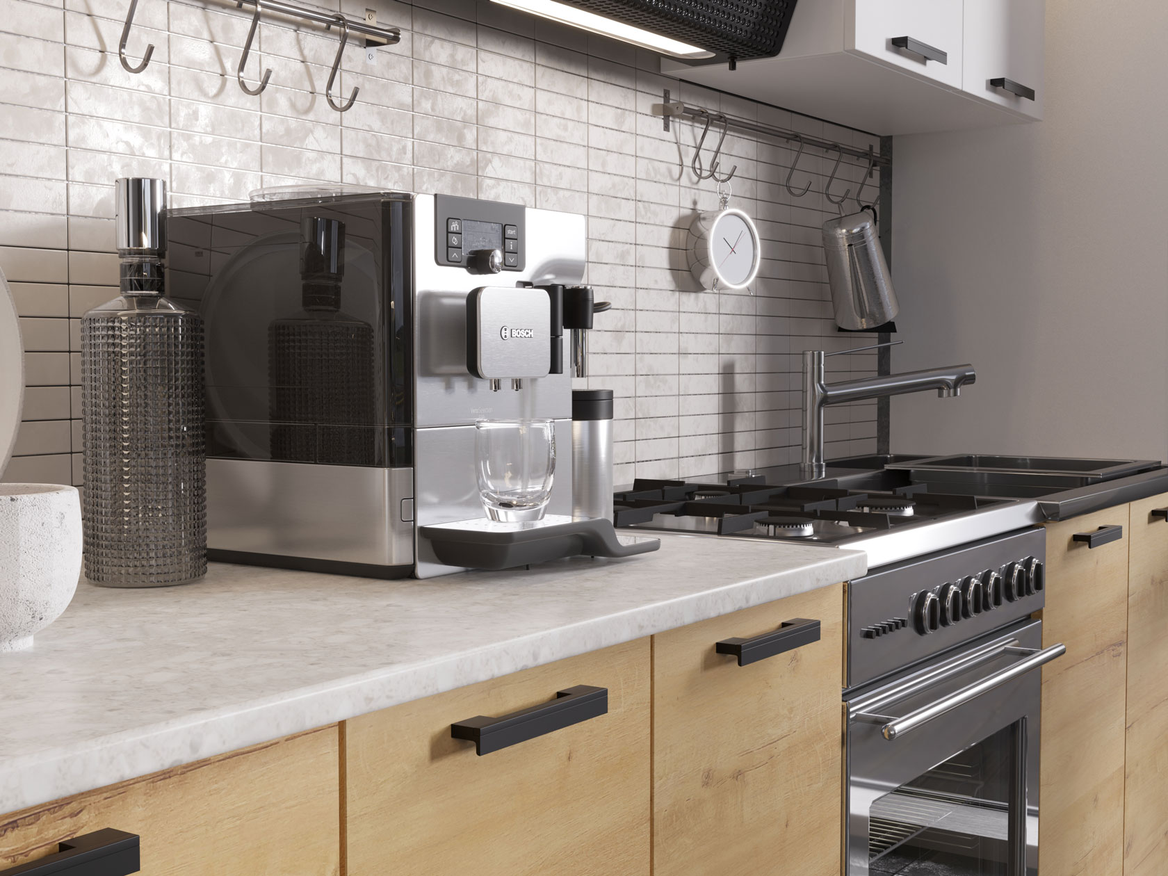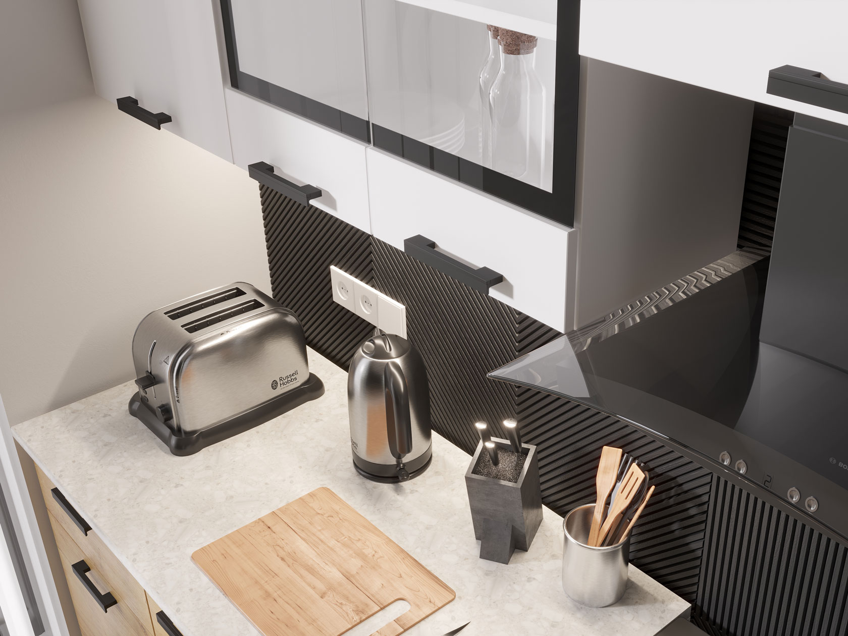 Черные ручки и рамка вокруг стекла — стильные акценты, с которыми кухня выглядит по-настоящему привлекательно и небанально. Продуманное наполнение позволяет удобно разместить большое количество кухонной утвари.